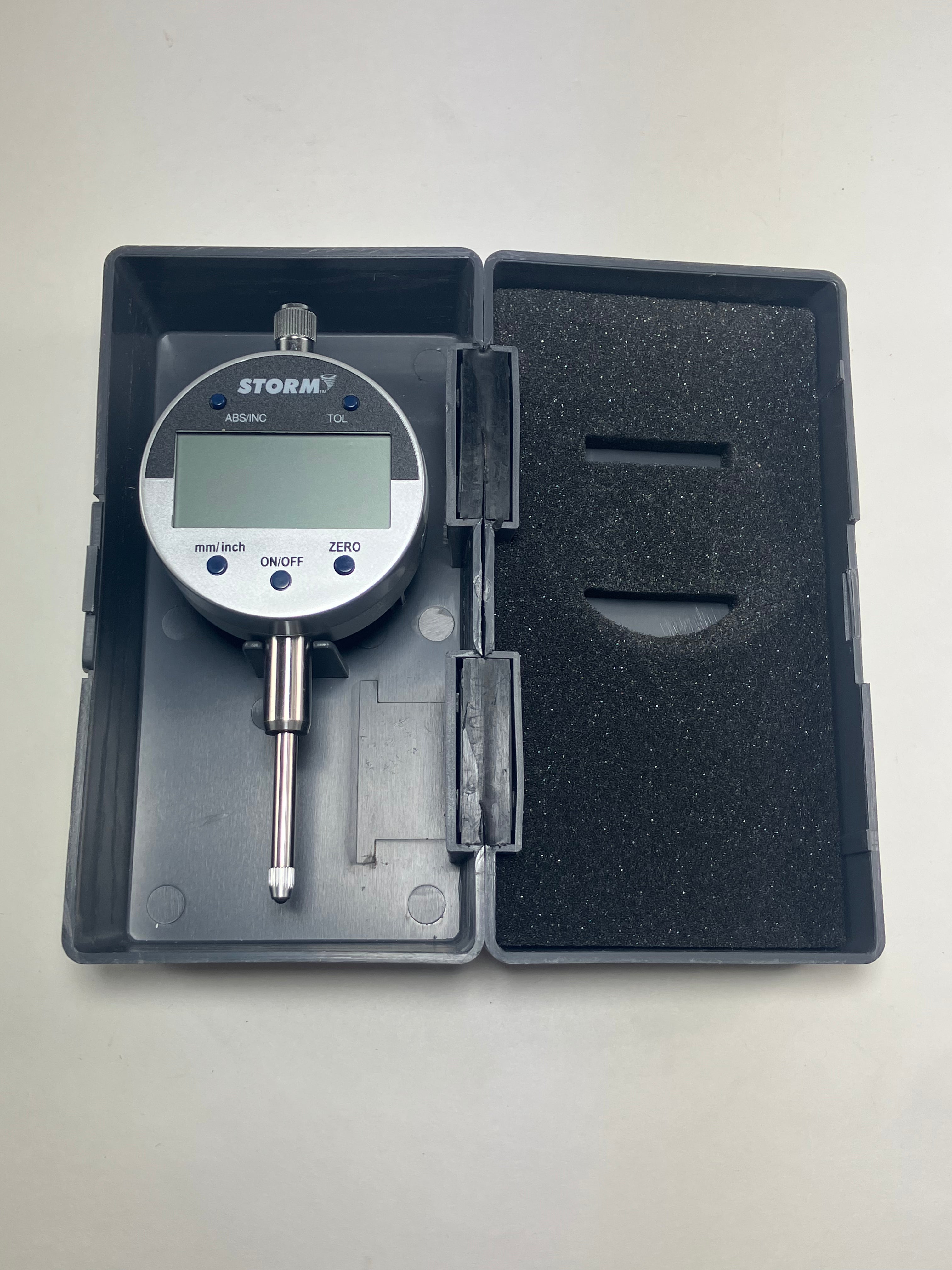 The Central Storm 3D105-01 Digital Dial Indicator offers precise measurements in inches, millimeters, and fractional inches with a 0-1” (0-30mm) range. Designed for metalworking and manufacturing, this tool features a clear digital display, on/off and zero buttons, and a hold function to lock readings. Its on/off magnetic base ensures stable, easy mounting, making it indispensable for accurate inspection and quality control in professional industrial environments. Compact and durable, it comes housed in a protective plastic case.