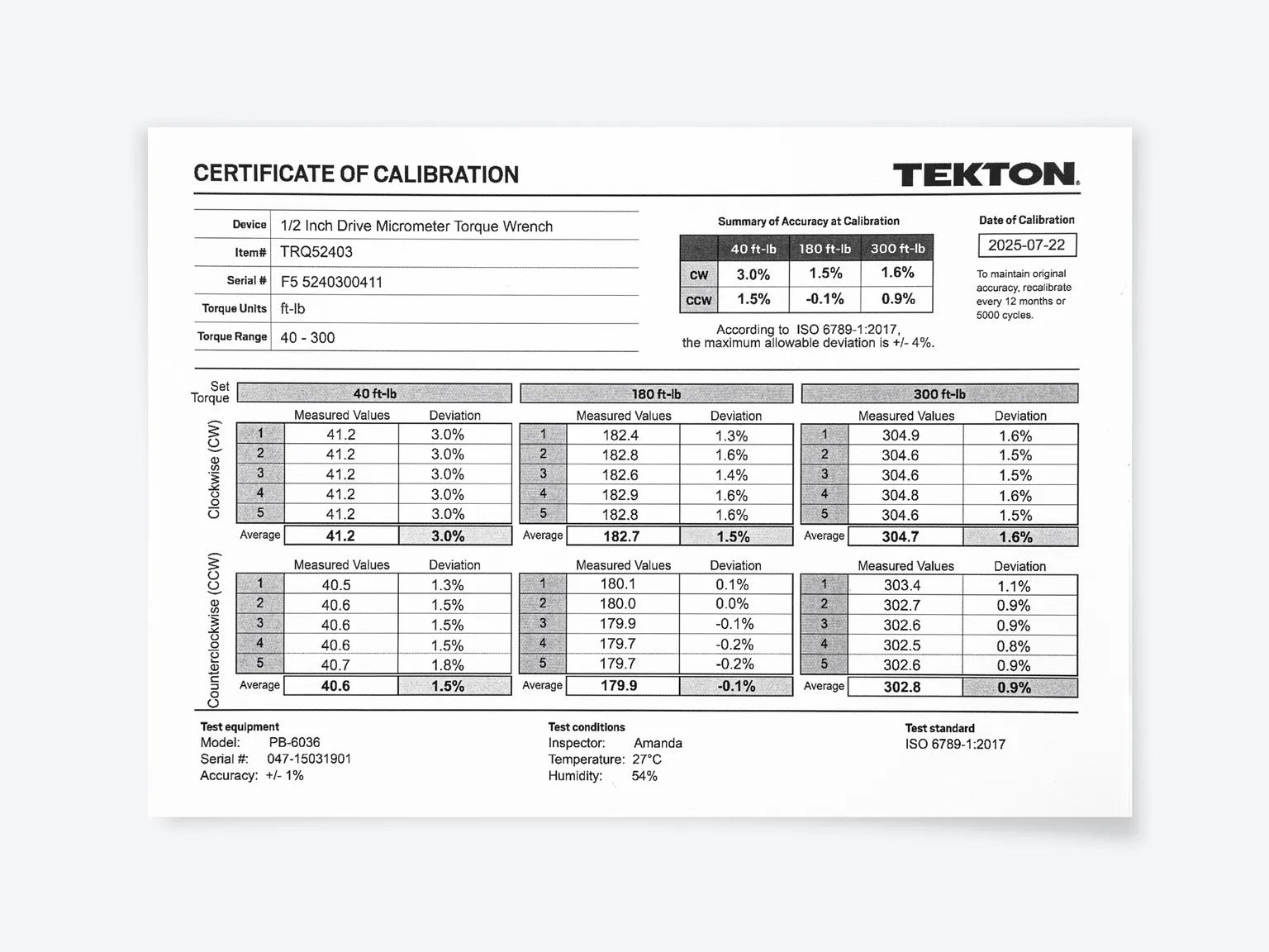 - Certified to the ISO standard for the full listed range (40 - 300 ft-lb), unlike torque wrenches calibrated to ASME standards, which do not require calibration below 20% of the listed range