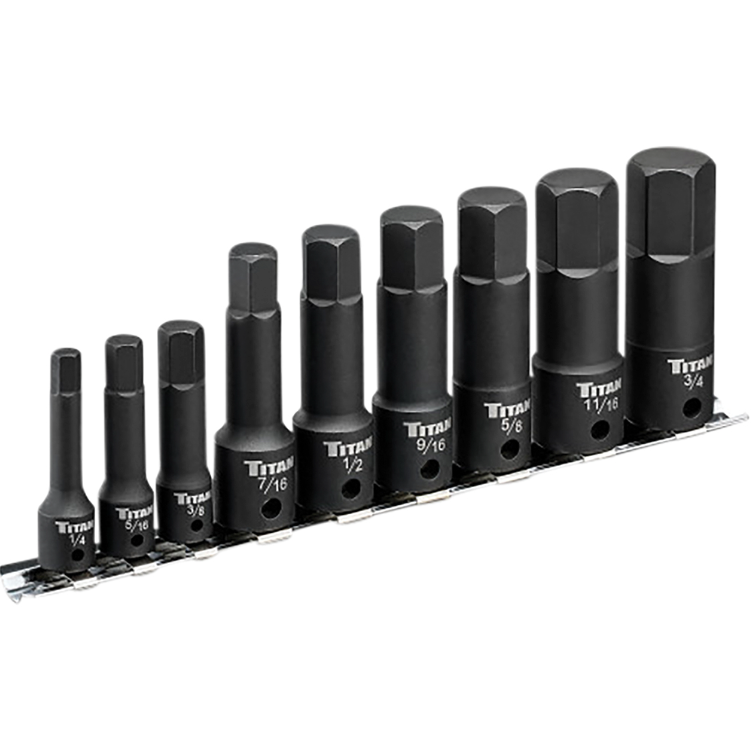•TITAN® 9 Piece Impact SAE HEX Bit Socket Set is for use with fasteners found on a variety of vehicles and multiple other applications.