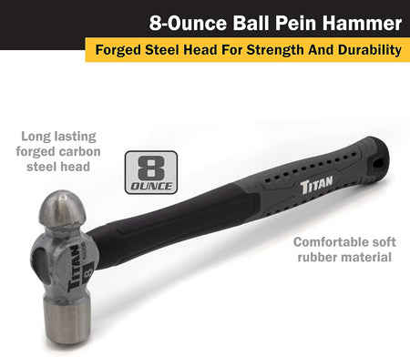 Titan 63308 8 oz Ball Peen Hammer features a long lasting forged carbon steel head and a comfortable soft rubber grip handle.