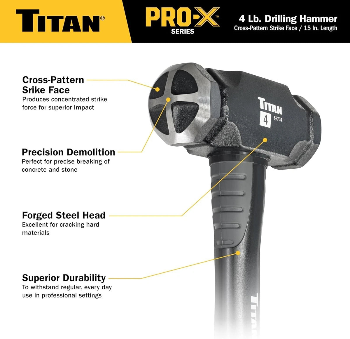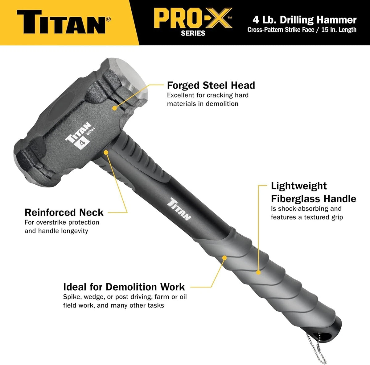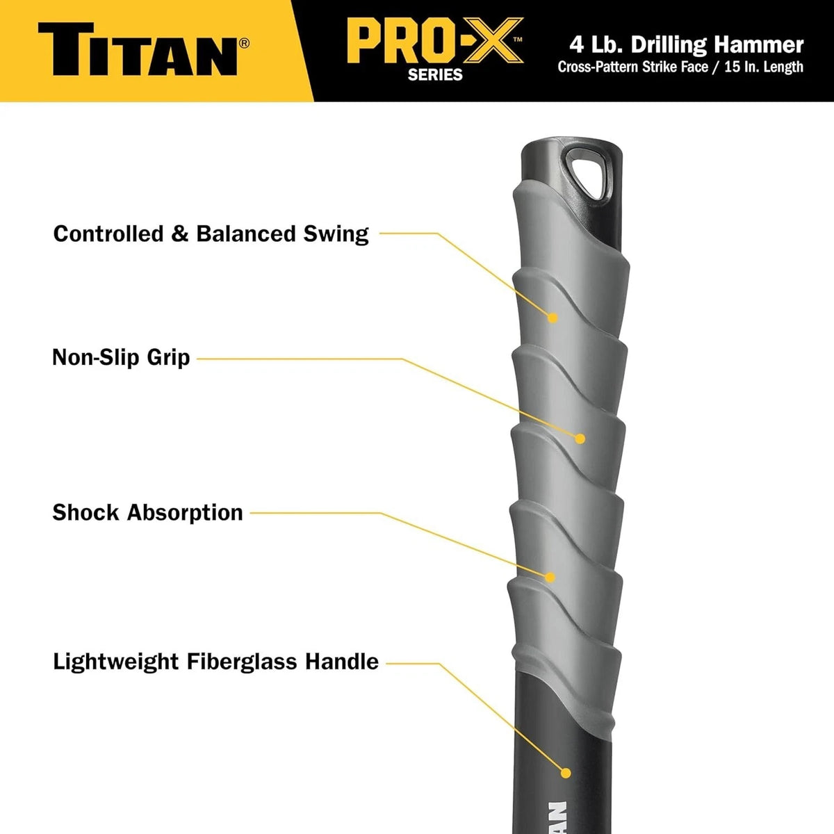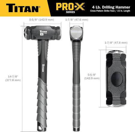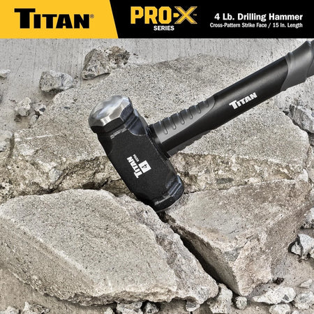 Titan Pro-X 63704 4-Pound x 15-Inch Drilling Hammer features a cross-pattern strike design that concentrates the strike force into a smaller surface area, thereby creating greater power per strike. With a flat striking surface, the force is distributed across a larger surface area thus diluting the strike force. The cross-pattern face is excellent for cracking hard materials. For demolition applications, begin with the cross-pattern face to break up materials, then switch to the flat surface to complete the demolition. This hammer is a perfect balance of size and weight for precision work. It is ideal for demolition work, spike, wedge, or post driving, farm or oil field work, and many other tasks. The fiberglass handle is bolstered by a reinforced neck for overstrike protection. The handle also has a comfortable, textured grip for handling ease and fatigue reduction.